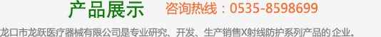 龍口市龍躍醫療器械有限公司是專業研究、開發、生產銷售X射線防護服,鉛膠衣系列產品的企業。 公司占地12800余平方米,設備齊全,檢測完善,職工108人,其中工程技術人員38人,技術力量雄厚,質量可靠,投入市場已有多年的歷史。龍口市龍躍醫療器械有限公司生產的“宇龍”牌X射線防護服系列產品。產品包含新型X/R射線防護服系列,X射線防護面罩,FC超柔軟型X射線介入防護產品,FA-1柔軟X射線介入防護產品,FE超薄型卷材鉛膠皮材料等,經衛生部射線防護器材防護質量檢測中心監測全部達到國家標準。超薄,超柔軟多層防護服系列產品達到國際同類產品水平。
